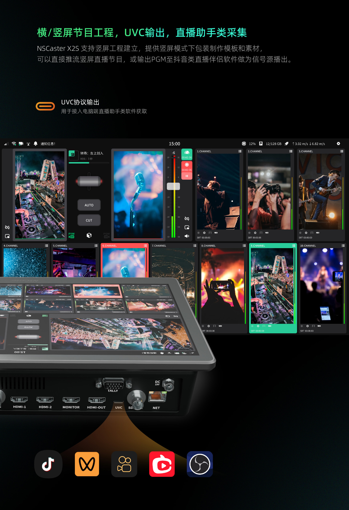 NSCaster X2S 支持UVC协议的TYPE-C接口输出,可将导播制作信号接入笔记本电脑,用于各种直播助手类软件端开播。