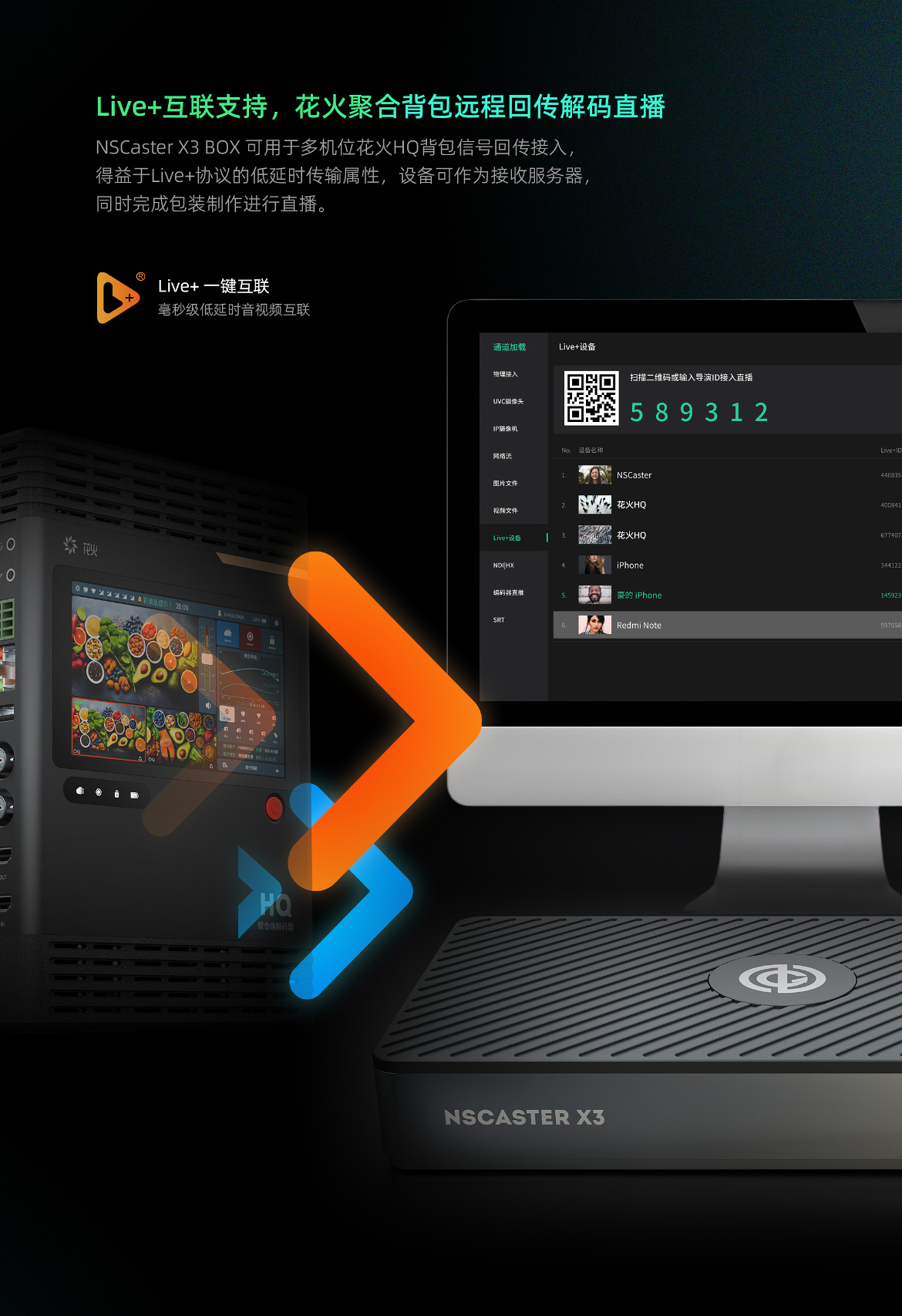 NSCaster X3 BOX 是一款嵌入式的12路直播工具,支持全高清制式节目制作并推流录制。设备支持SDI×4 + HDMI×2物理接口1080p60信号输入;支持众多主流格式流信号加载接入和LIVE+协议花火HQ聚合编解码器、纳加手机拍客APP等设备互动接入。