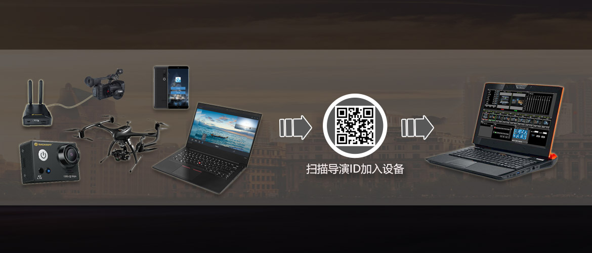 VJDirector2具备唯一的导演ID及对应二维码,通过输入导演ID或扫描对应二维码,即可快速与其它各类前端采集设备(例如:手机、编码器、无人机、运动相机等)之间实现互联互通、互相协同,依靠网络系统形成整体的直导播解决方案。