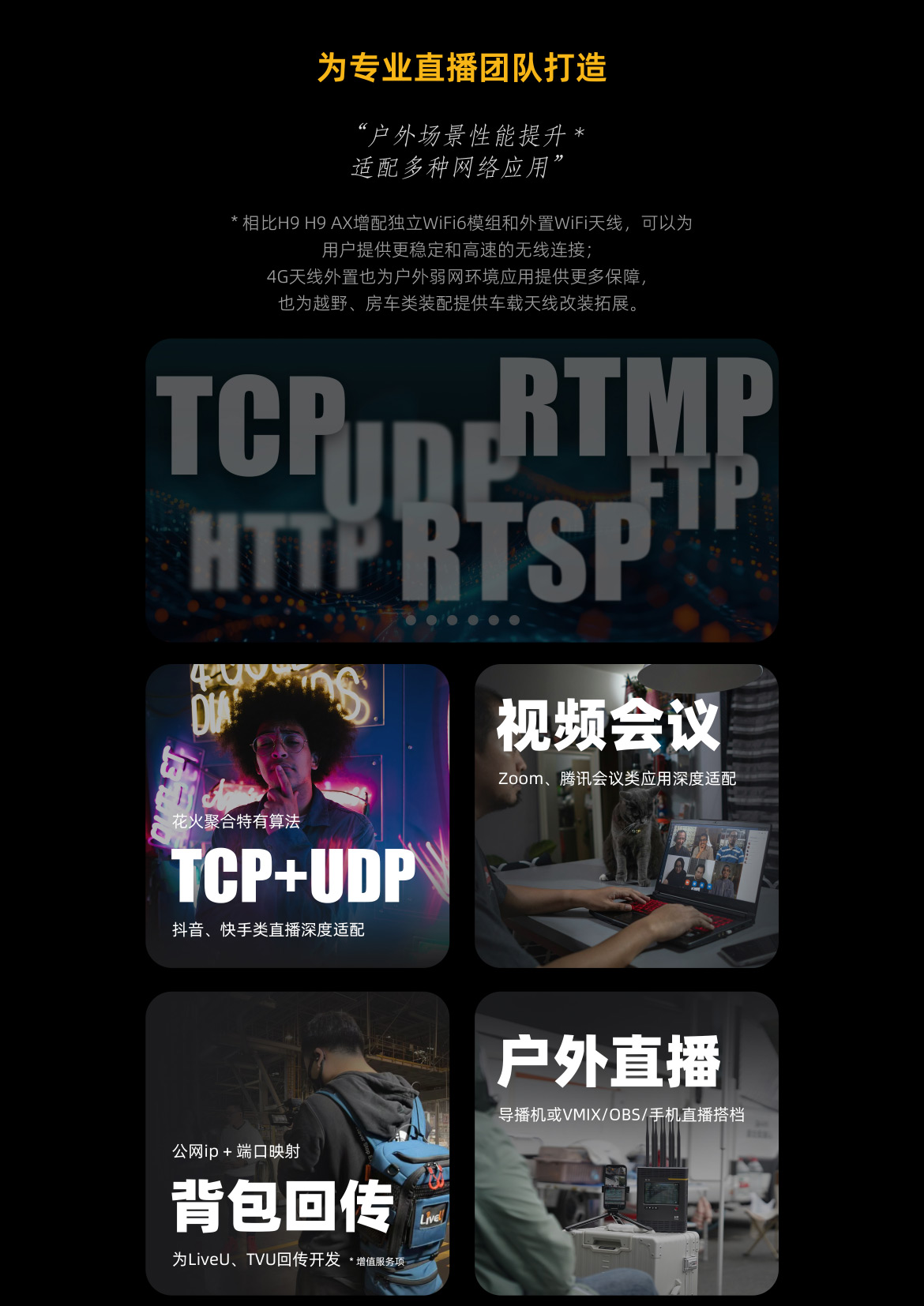 H9内置5G、4G模块,支持支持5G NSA/SA、4G全网通,支持不同运营商(电信、移动、联通、广电)的SIM卡。最高支持10链路聚合(H9最高配版本支持5G×3+4G×3+USB×2+WAN×1+WIFI×1);设备内置AX3000 WiFi6模组,并外置天线,为无线连接方式应用提供高效稳定的聚合网络热点。